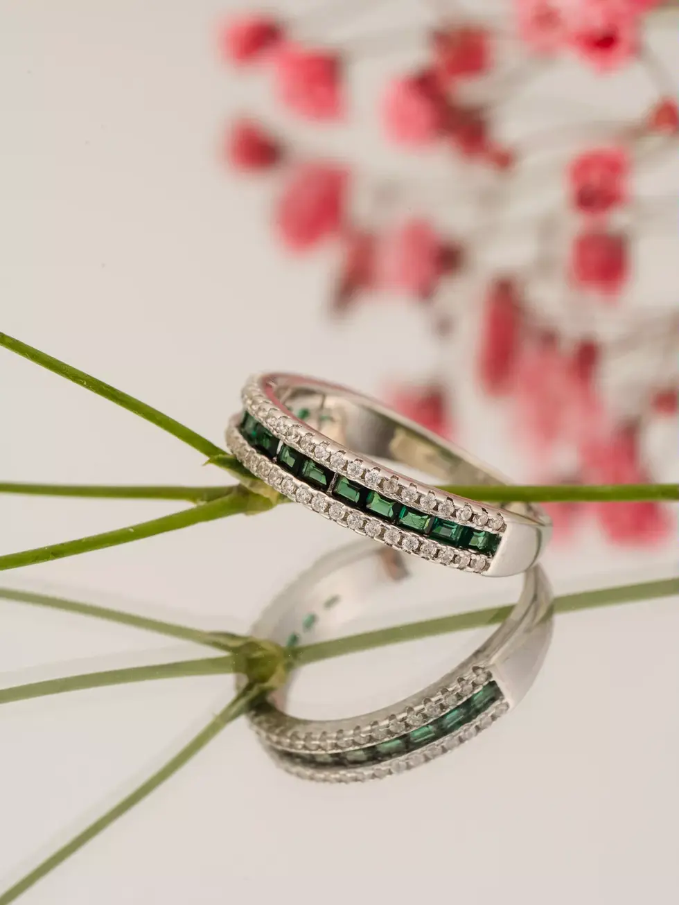 טבעת כסף 925 בעיצוב יוקרתי של שלוש שורות משובצות — שתי שורות זרקון לבן נוצץ וביניהן שורה מרכזית בגוון ירוק עמוק ומרשים.