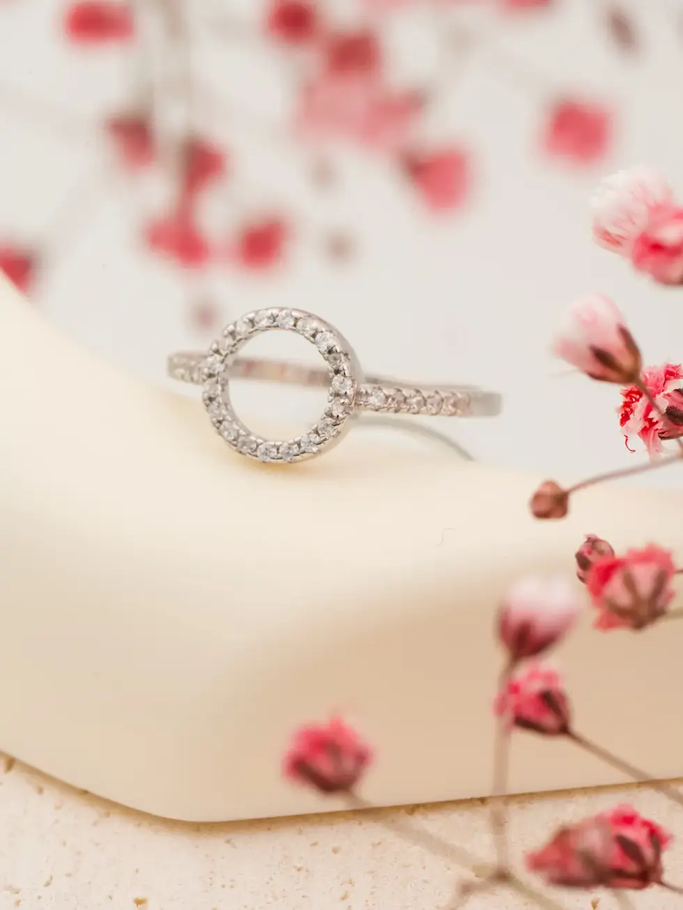 טבעת כסף 925 בעיצוב מעגל עדין ומשובץ זירקונים, המעניקים לה ברק אלגנטי ונקי.