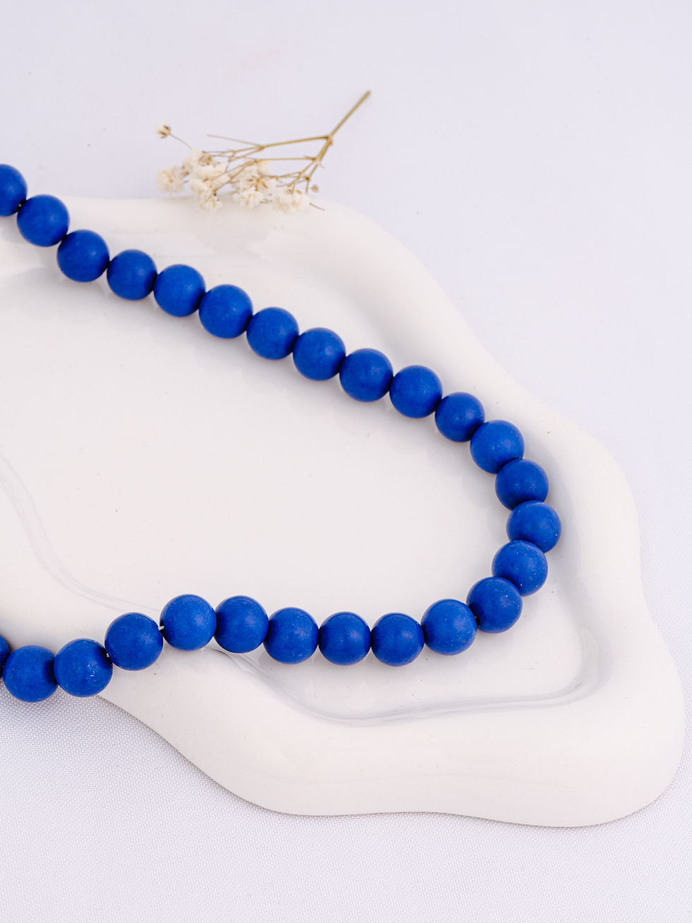 שרשרת חרוזים בגוון כחול עמוק, עשויה אבני זכוכית עגולות בקוטר 10 מ”מ בגימור מבריק שמושך את העין.